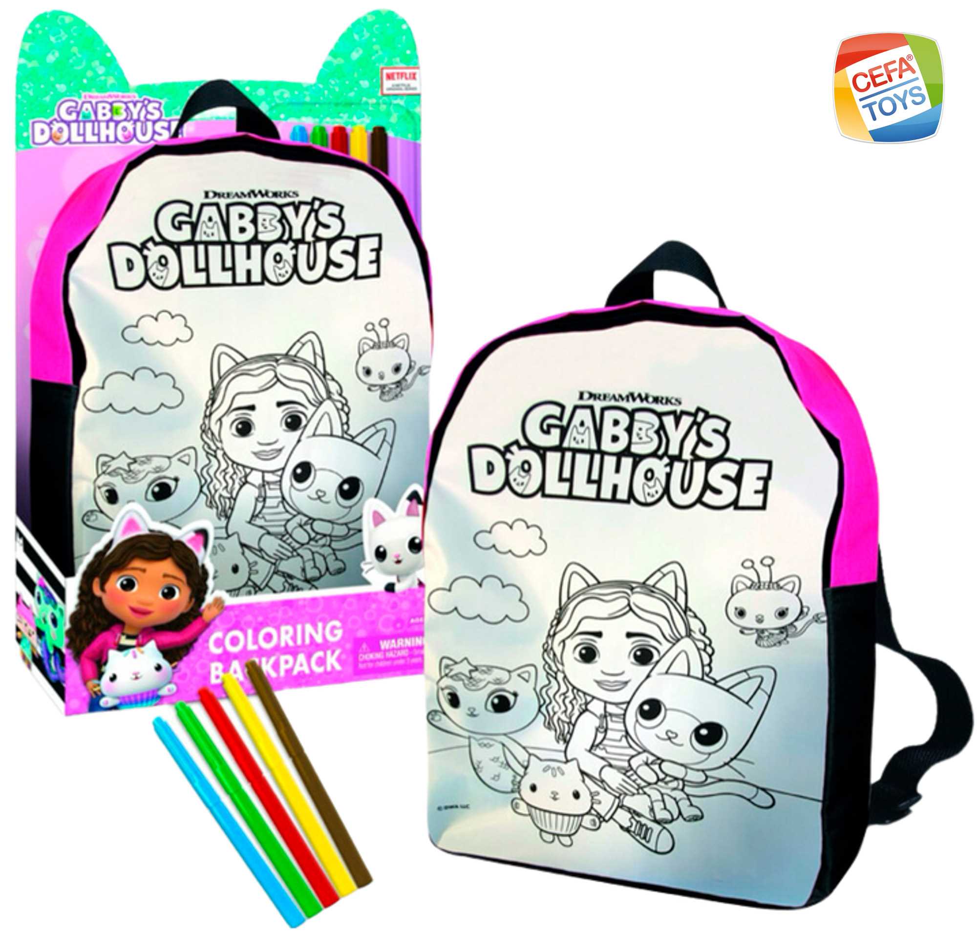 Personaliza y colorea tu propia mochila de la Casa de Muñecas de Gabby. Incluye 5 rotuladores especiales para pintura sobre tela ¡Llévala a todas partes contigo y sorprende con tu creatividad!