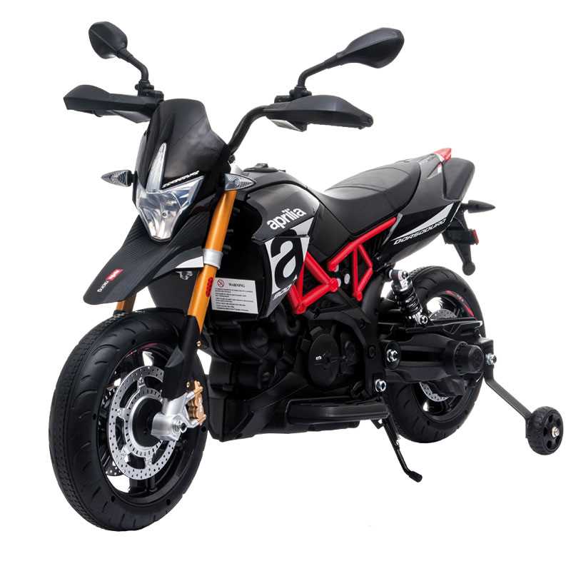 ¡Os traemos la Moto Aprilia Negra de Batería 12V! Amantes de las motos, la moto ideal para los niños ha llegado. Este genial moto de batería, modelo Aprilia, tiene una batería de 12V con dos motores de 18W y ruedines para facilitar su conducción. Las ruedas son de Goma EVA y tiene el acelerador en el pie. La Moto Aprilia Negra de Batería 12V lleva también luces y música, ¡para que la diversión no termine!. Peso máximo recomendado por el fabricante es de 30 Kg. Dimensiones aprox.: 108x48x71cm.