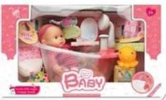 ¡Déjala limpita a tu Muñeca bebé favorita con la nueva Bañera Baby! Ponle su camisetita roja con lunares blancas, pantalones con patrones de color azul y el lacito del mismo color del pantalón. Será fácil bañarla gracias a los accesorios que trae el propio set: bote de champú, bote de gel, jabón, patito de juguete para que juegue tu muñeca bebé. Después del baño podrás ponerle el pañal y darle de comer con el biberón. ¡Cuida a tu muñeca bebé!