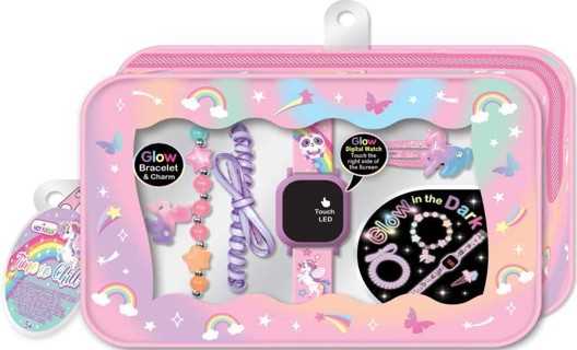 Lleva todas tus cosas con este bolsito transparente lleno de arcoiris. Dentro viene un reloj digital y varios accesorios como; 2 brazaletes, pasador de pelo de unicornio. Tanto los accesorios como el reloj, ¡brillan en la oscuridad!