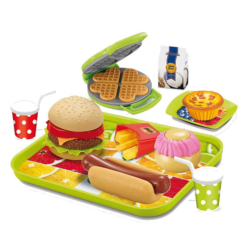 Serás un experto en hamburguesas y perritos calientes con este Set Hamburguesería Infantil. Sirve un rico menú de hamburguesa con patatas y postre a tus amigos y disfruta viéndolos comer. Para el postre puedes hacer unos ricos gofres con forma de corazón en la gofrera. Este set incluye 2 vasos, 1 bandeja, 2 platos, 1 hamburguesa, 1 perrito caliente y varios accesorios más.