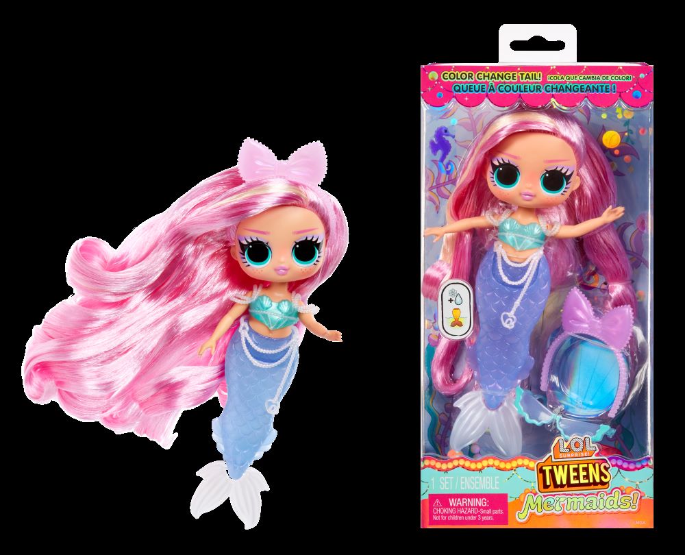 ¡Presentamos las nuevas sirenas L.O.L. Surprise! Tweens! ¡Descubre 4 nuevas muñecas de moda Tweens con nuevos looks de sirena que incluyen preciosas colas de sirena que cambian de color! Estas preadolescentes vienen con múltiples sorpresas temáticas de sirena para descubrir, ¡incluyendo looks, accesorios y más! ¡Colecciona a las 4 mejores amigas!