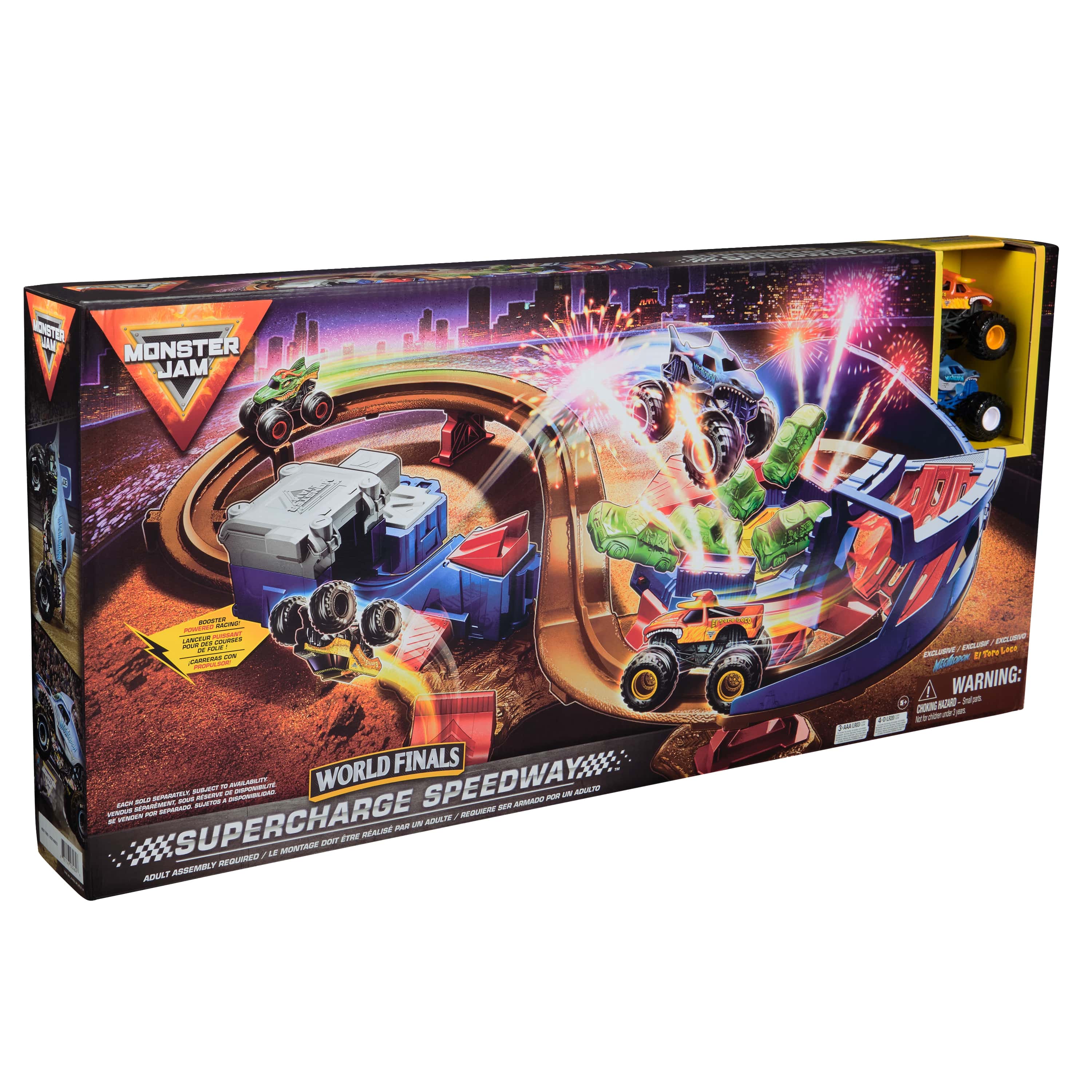 Juega con más emoción que nunca con los camiones monstruo a escala 1:64. Estos coches de juguetes combinan la fuerza y el rendimiento de los Monster Trucks para ofrecer una experiencia de juego llena de acción y acrobacias imposibles. El escenario Supercharge Speedway se ilumina y te permite llevar toda la adrenalina del circuito con forma de 8 de la final del mundial de Monster Jam oficial a casa. ¡Corre en un bucle cerrado para disfrutar en una carrera sin fin!