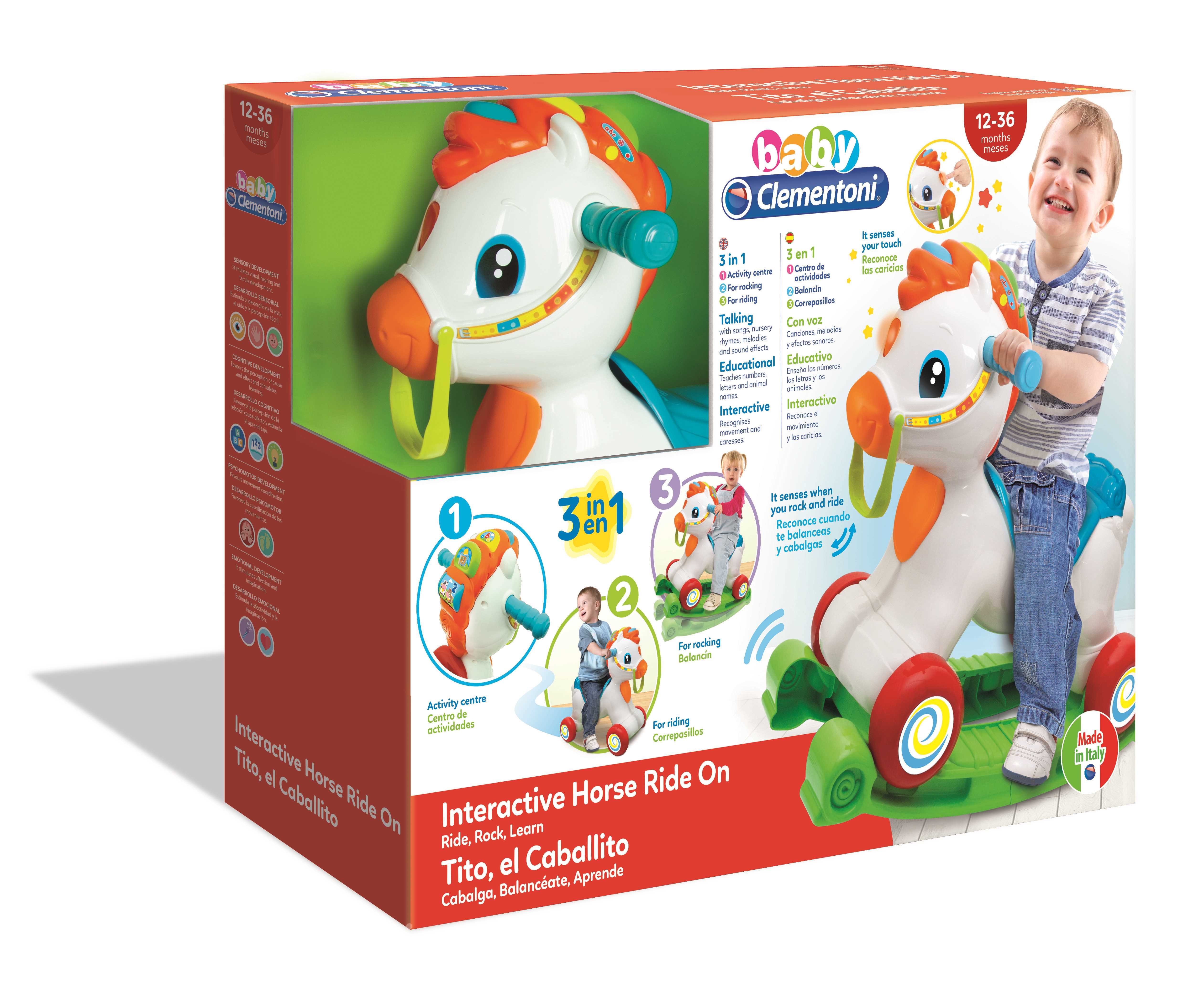 Equipado con un sensor, el caballito reconoce el movimiento e involucra al niño con sonidos realistas, palabras dulces y canciones divertidas.