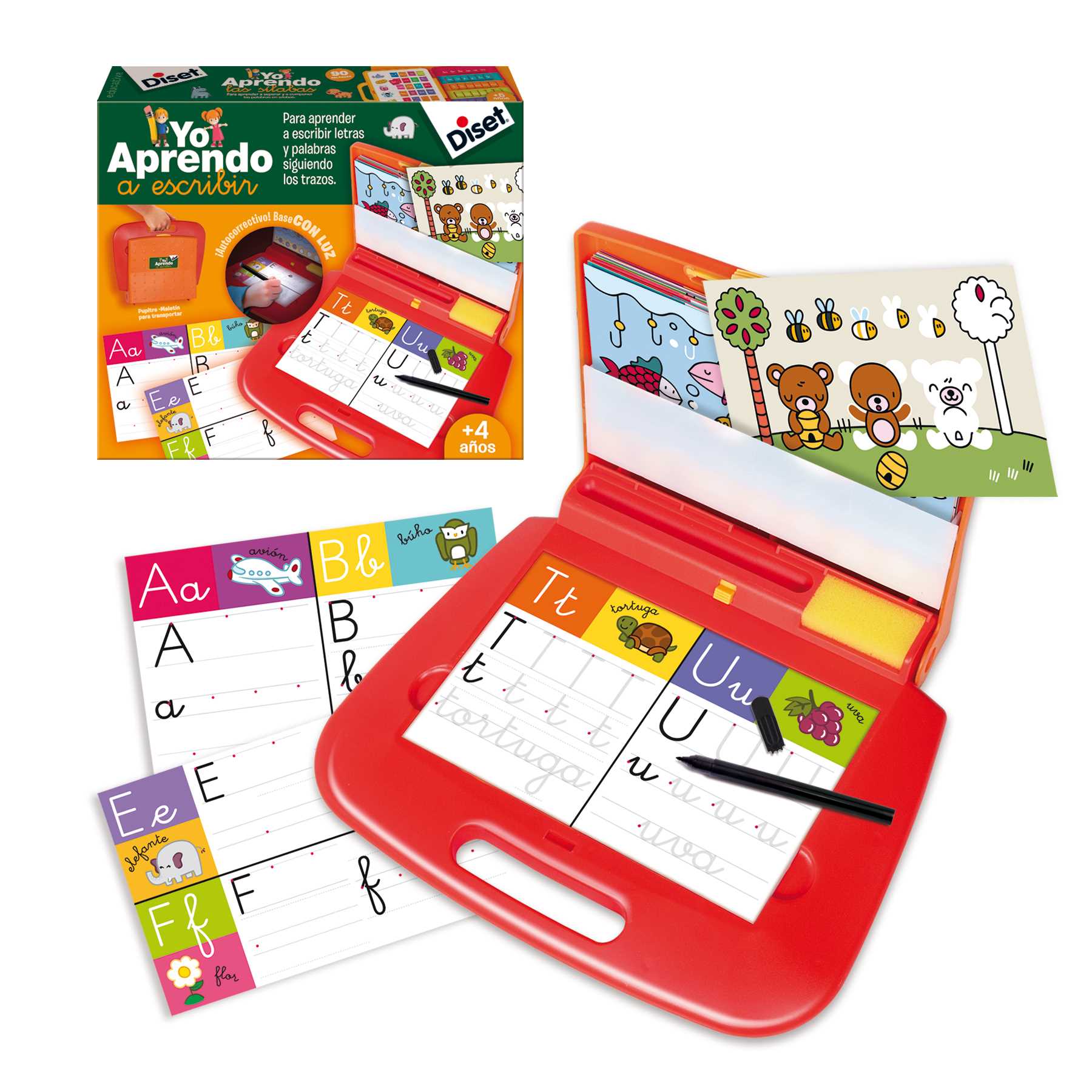 Este juguete educativo con el que tu niño aprenderá a escribirletras y palabras siguiendo los trazos forma parte de una completa y popular línea de maletines educativos con diferentes actividades escolares con las que tu niño aprenderá y practicará a leer, escribir, componer palabras, separarlas por sílabas, vocabulario en inglés, realizar sencillas operaciones… Un refuerzo escolar ideal para el aprendizaje del abecedario y la escritura a través de los diferentes trazos de las letras de niños a partir de 4 años, ¡Ahora con nuevo contenido, nuevas ilustraciones y nuevo diseño! Con Yo aprendo a escribir tu niño podrá practicar sus primeros trazos para aprender a escribir las primeras letras del abecedario en mayúsculas y minúsculas y algunas palabras de forma sencilla y divertida. Este juego consta de 21 láminas de dificultad progresiva que se pueden borrar y así tu hijo podrá practicar tantas veces como quiera. Además, le ayudará a desarrollar la capacidad de concentración, mejorar la coordinación ojo-mano y la motricidad fina. Sin darse cuenta aprenderá jugando y pasándolo en grande todo el abecedario!! Gracias a la base con luz que tiene el pupitre, que sirve como sistema autocorrectivo, el niño podrá comprobar si está realizando el trazo correcto. El pupitre-maletín convierte este juguete en un producto ideal para guardar las láminas en su propio compartimento, transportarlo y jugar sobre él.