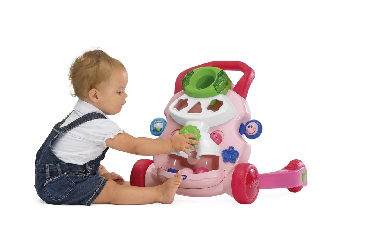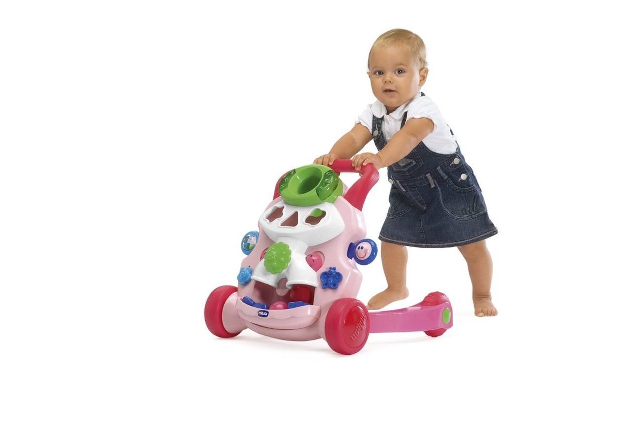 Primeros Pasos Musicales ayuda al niño a estar de pie y dar sus primeros pasos con seguridad: Es suficiente con apoyarse y empezar a caminar, y enseguida el juguete comienza a tocar un divertido twist que se interrumpe si el bebé se detiene, para animarlo a seguir caminando.
