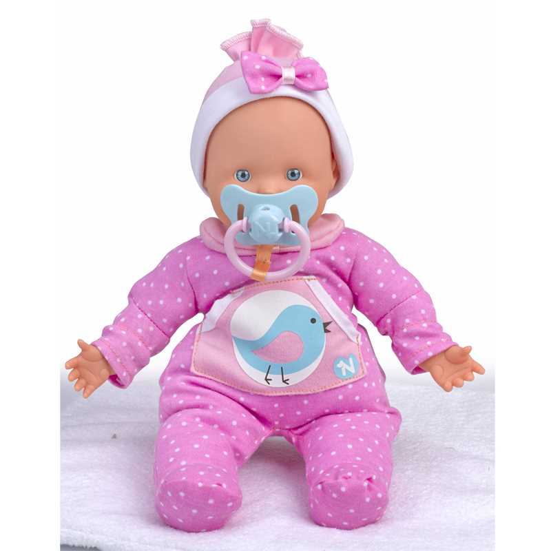 Muñeco blandito con vestido decorado con pájaros y con gorrito. Si le das el chupete hará sonidos de chuparlo, pero si se lo quitas se pondrá a llorar. Además, puede meterse el dedo en la boca como los bebés de verdad.Dos modelos a elegir.