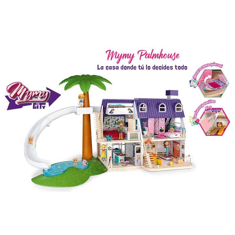 Ha llegado la Mymy City, es una de las ciudades más peculiares y divertidas de todas las que conoces. Dentro de ella encontrarás miles de historias y aventuras que vivir gracias a sus habitantes y accesorios. Palmhouse es ideal para la familia de Mymy City que a parte de tener una decoración muy moderna, cuenta con dos plantas con estancias, un tobogán que da a la piscina, con luz, timbre de verdad y muchos accesorios