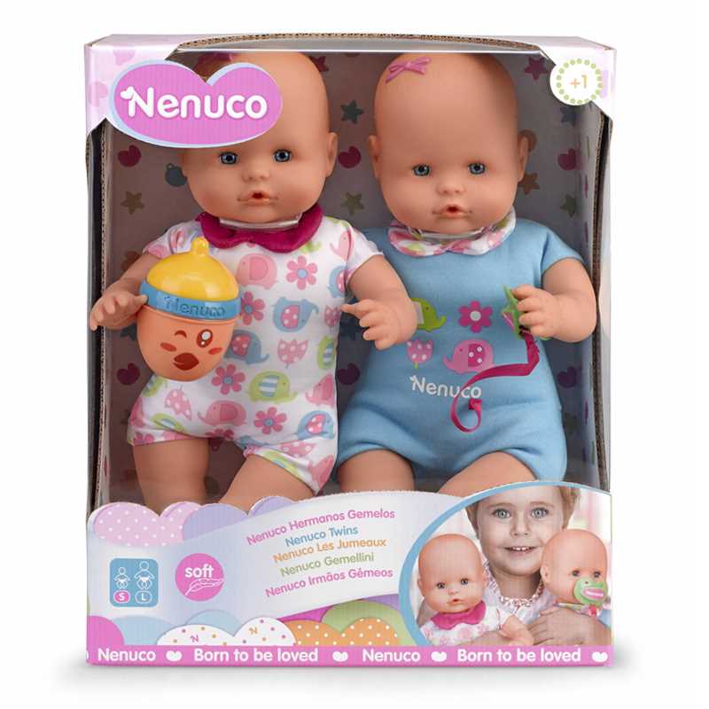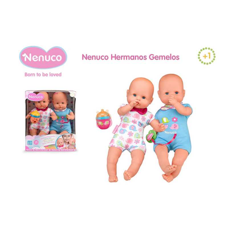 Gemelos Nenuco blanditos con diferentes vestidos. Un muñeco lleva un biberón que además es sonajero y tentetieso y otro muñeco lleva un chupete.