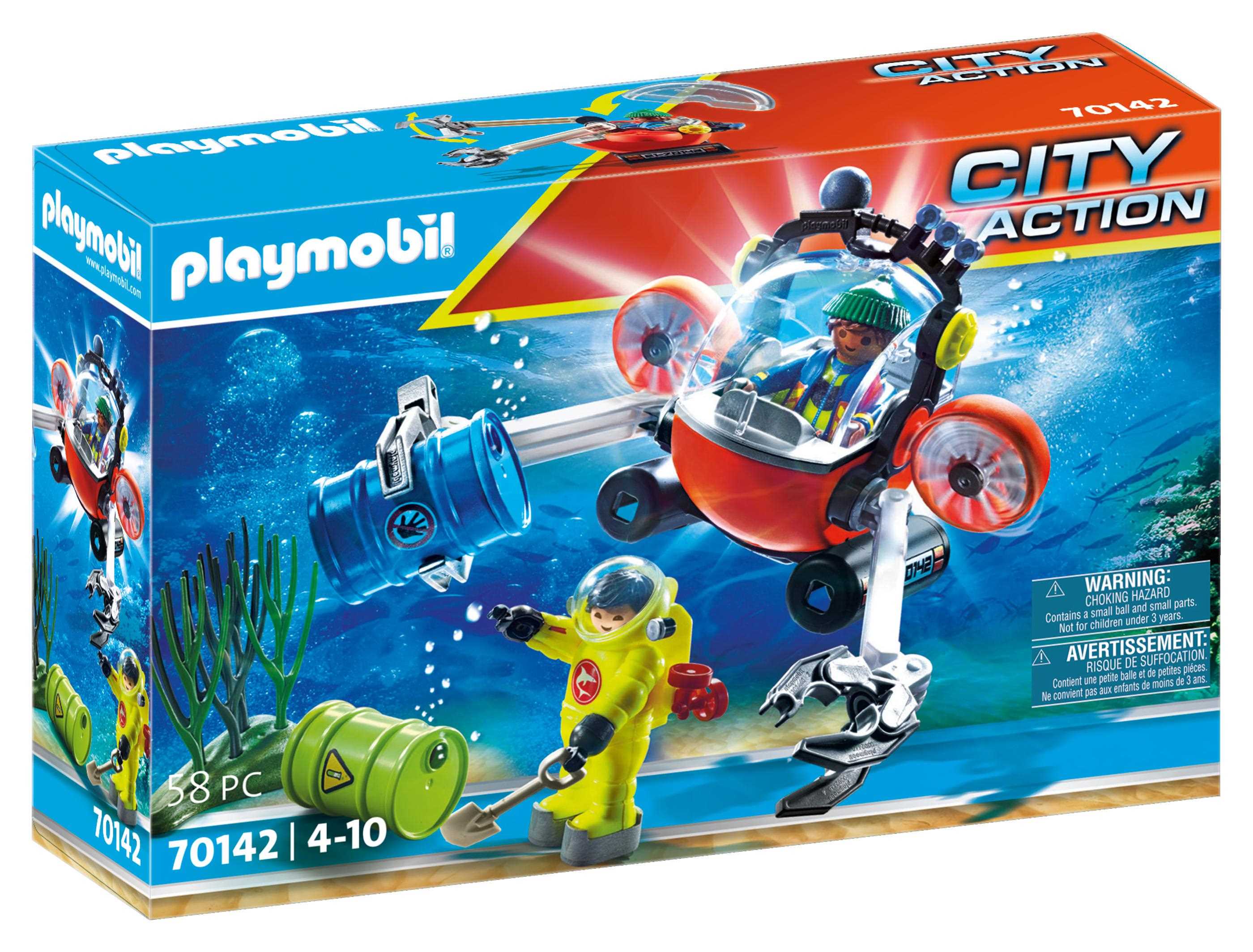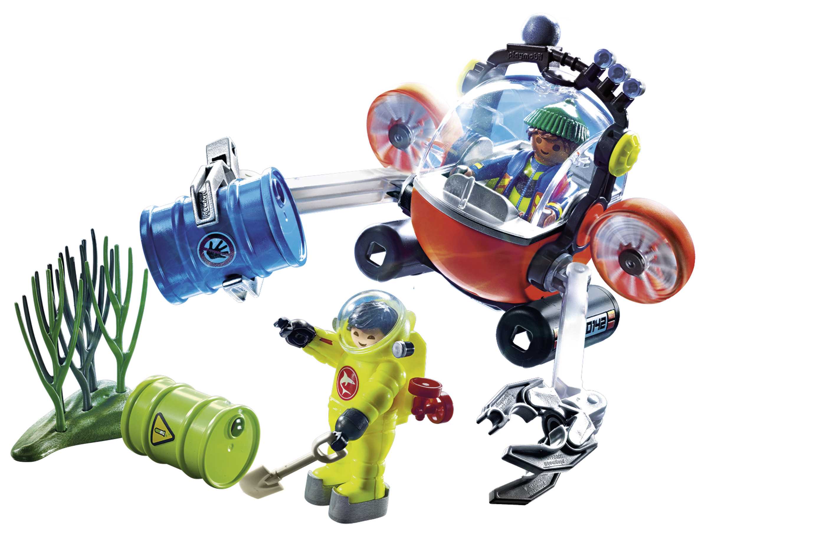 Dos buzos han descubierto toneladas de contenidos peligrosos en el fondo del mar, que deben ser rescatados urgentemente. Los investigadores utilizan su robot de buceo móvil para esta difícil misión. Se acercan lentamente a los dos barriles y los recogen con sus brazos de agarre. Ahora el material peligroso es transportado cuidadosamente a la superficie y luego es eliminado. El set de juego consta de dos figuras PLAYMOBIL, un robot de buceo con brazos de agarre móviles, una escafandra de alta mar, dos toneladas, una pala y muchos otros extras. El robot de buceo puede nadar y bucear.