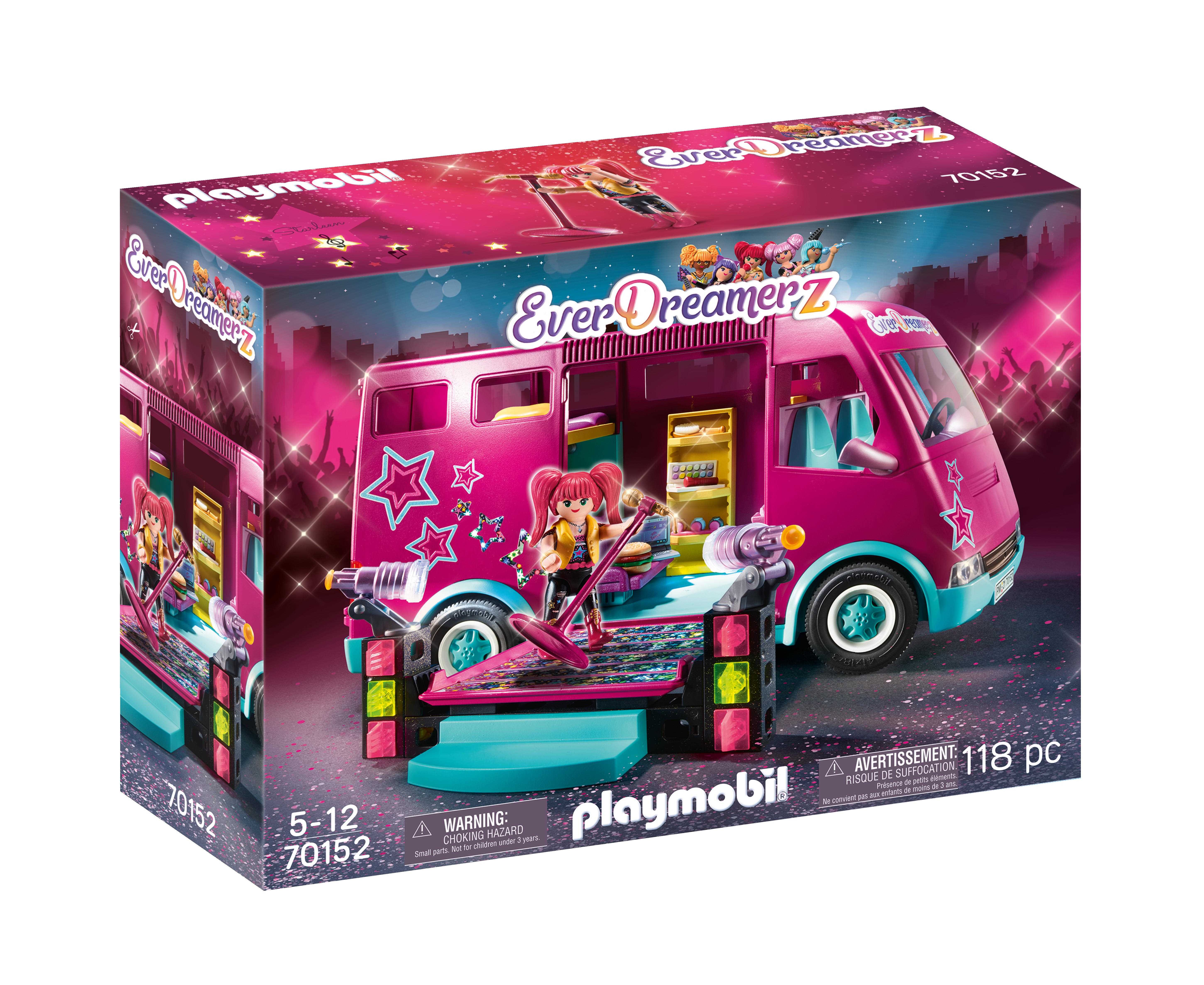 En el Tour Bus, con estrellas brillantes, las EverDreamerz conquistan el Music World. Como su nombre indica, todo Music World es acerca de la música. Las EverDreamerz, y especialmente Starleen, están totalmente en su salsa y van de concierto en concierto con su Tour Bus. Al llegar al siguiente lugar se abren las puertas traseras y se descarga el escenario móvil. Ahora la estrella pop Starleen se pone guapa delante de los grandes espejos y luego se dirige al escenario. ¡El espectáculo puede comenzar! El set de juego contiene a la EverDreamerz Starleen, un autobús con rampa y bastidor de escenario con focos. Dentro del autobús hay dos lugares para dormir, una barra de ropa, un estante, dos espejos y muchos más accesorios.