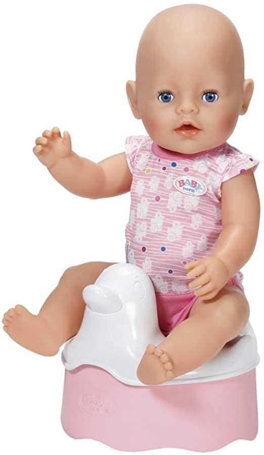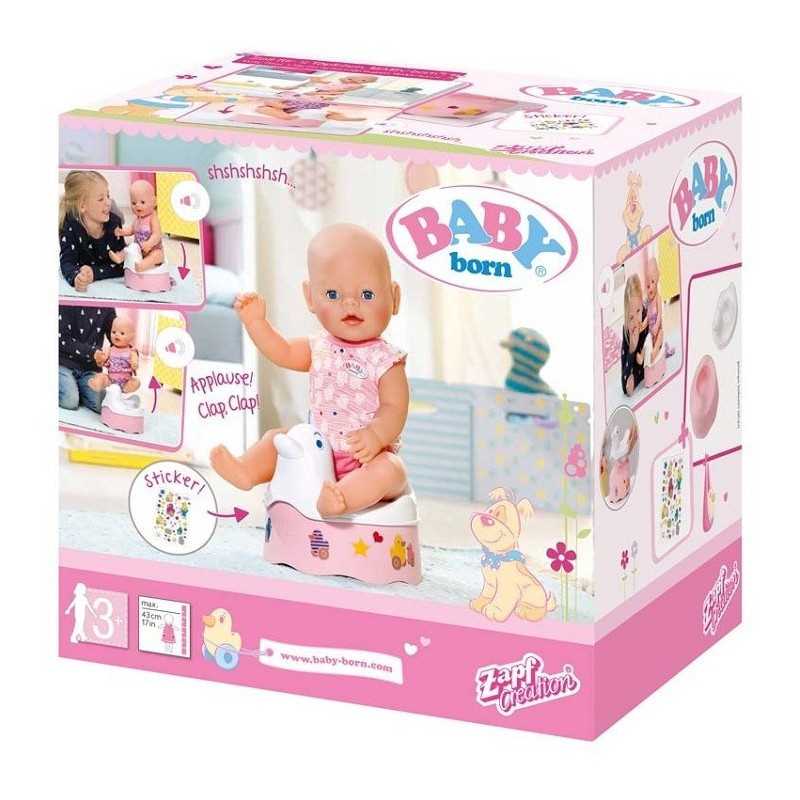 Cuando BABY born® se sienta en su orinal, una divertida melodía comenzará a sonar mientras se escucha sonido de pipí. Después de usar el baño, BABY born® recibirá un aplauso como recompensa. El asiento de pato puede retirarse y limpiarse fácilmente con un paño húmedo. ¡Y con las pegatinas podrás personalizar el orinal a tu gusto!. Bandai 822531.Muñeco no incluido.