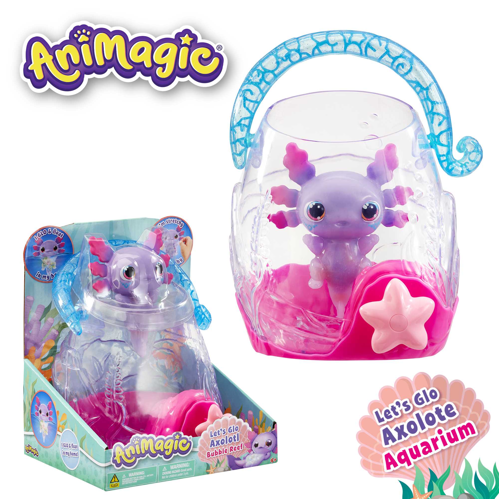 ¡Let´s Glo Axolotl Bubble Reef es la casa de tus sueños Let´s Glo Axolotl! Llena el Bubble Reef con agua, presiona el botón mágico de la burbuja y observa cómo Axolotl baila alrededor de su acogedor hogar en el Acuario.