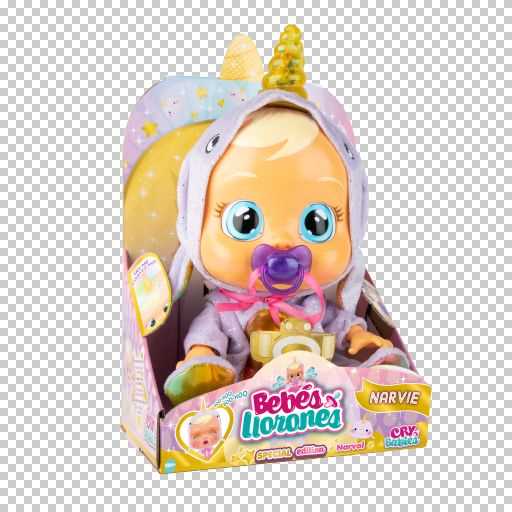 ¡Conoce al nuevo Bebé Llorón Narvie, lleva un adorable pijamita de narval! Pero eso no es todo, porque tiene una función especial, ¡su cuerno SE ILUMINA con luces cuando lo tocas! Como todos los Bebés Llorones… ¡Llora lágrimas de verdad cuando le quitas el chupete! ¡Pónselo otra vez o no dejará de llorar y cada vez lo hará más fuerte! ¡Y también lo puedes tumbar para calmarlo!