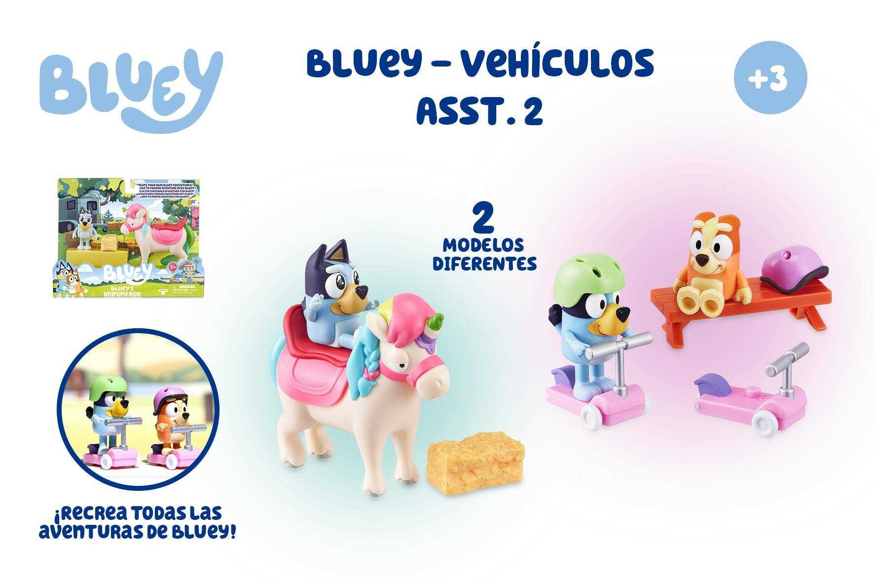 Lleva a Bluey y a sus amigos de paseo con los nuevos mini vehículos. Un surtido de dos vehículos diferentes para que las aventuras nunca terminen. En un pack vienen Bluey y Bingo con sus patinetes y en el otro viene Bluey con su mascota Unipony, ¡cómo en la serie! Las figuras de ambos packs son articuladas. Los vehículos son compatibles con el resto de figuras de la colección. Y los packs se venden por separado.