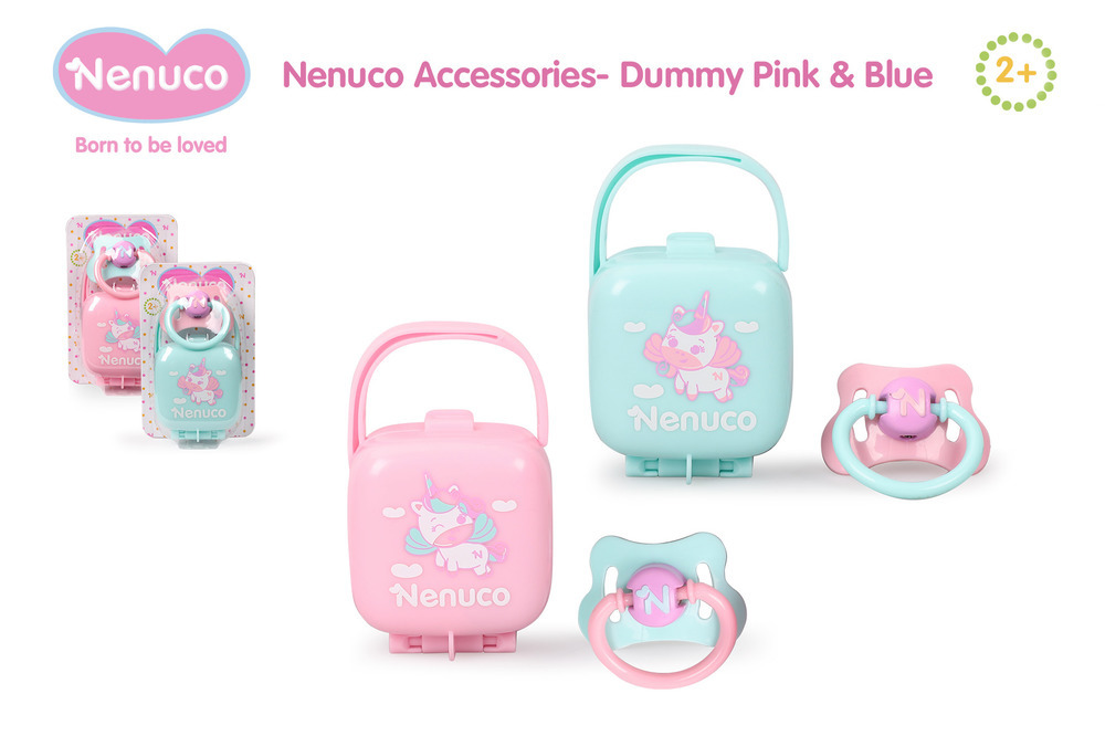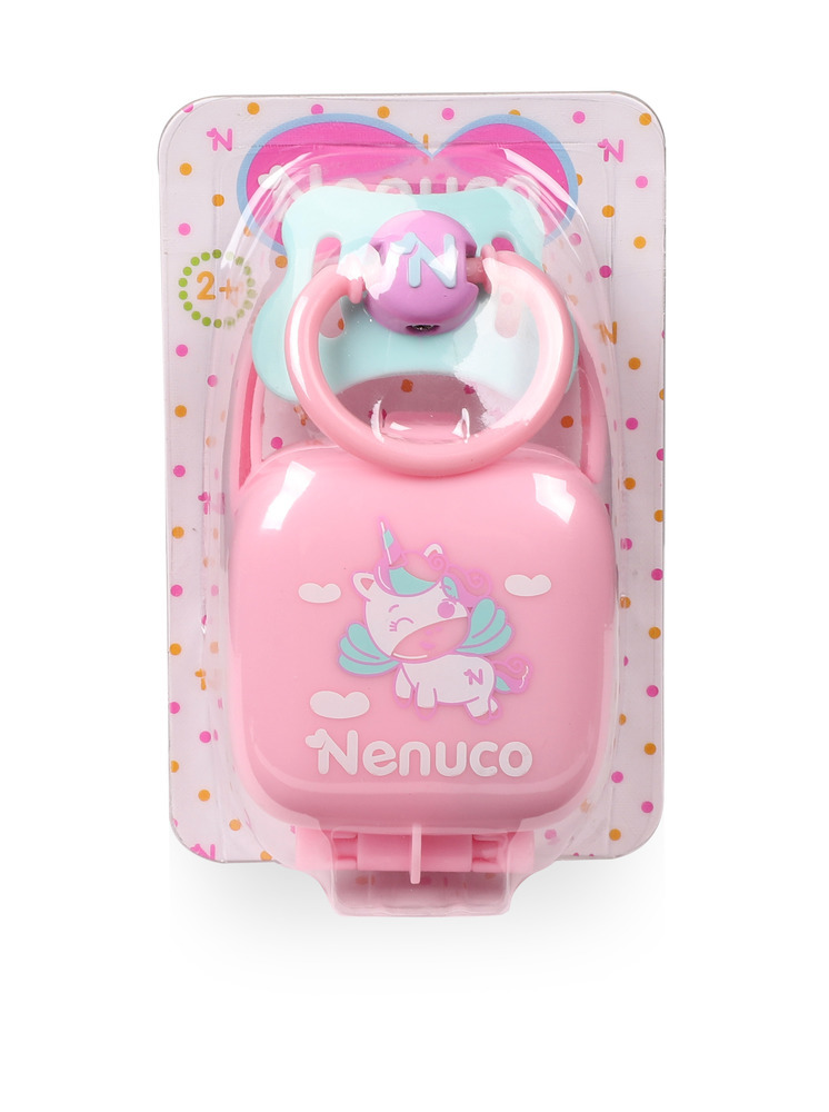 Surtido de dos chupetes decorados, que llevan una tira y un botón para usar de clip en la ropa. Incluyen carcasa para guardarlos