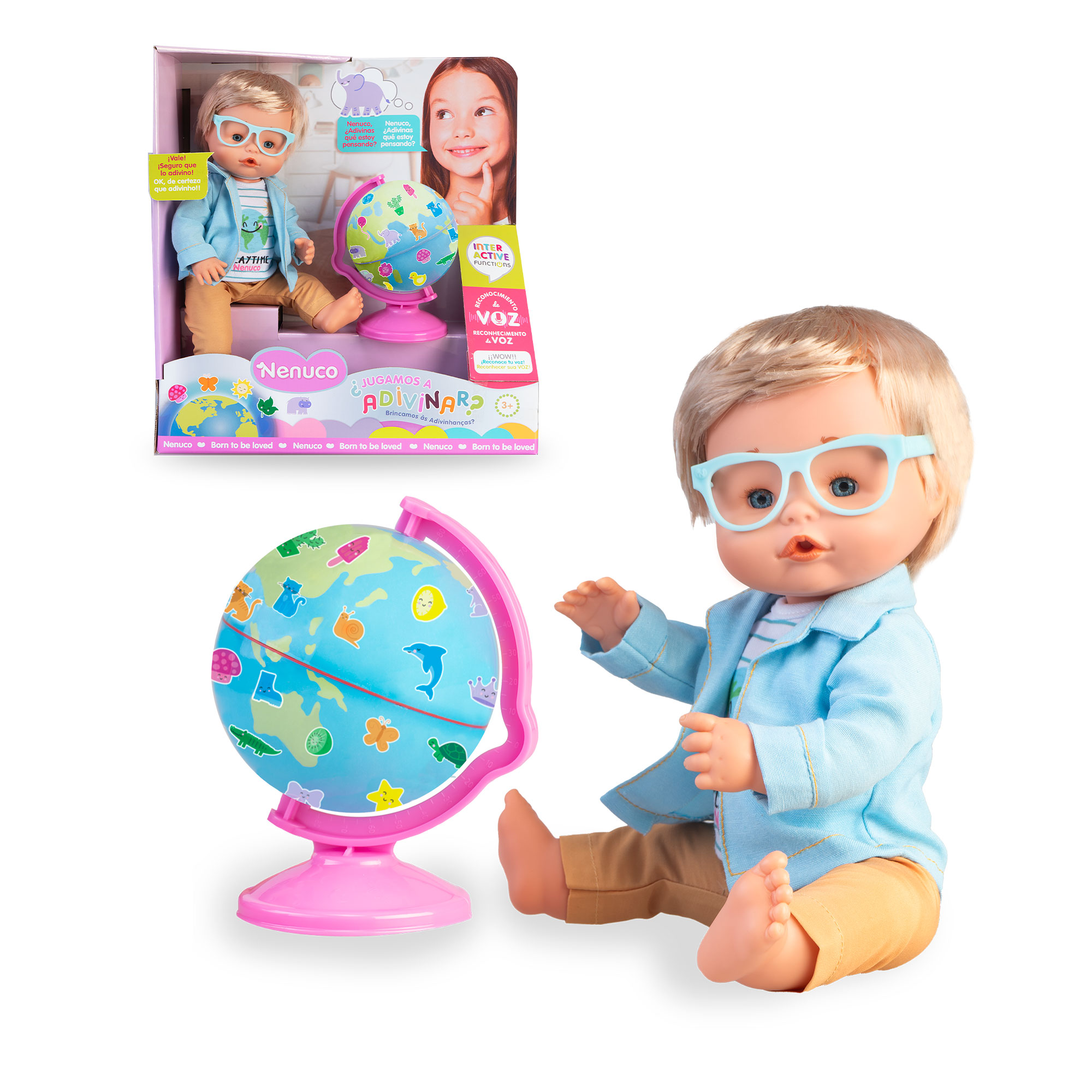 Nenuco, ¿Jugamos a Adivinar? Es un muñeco interactivo con tecnología de reconocimiento de voz que puede adivinar lo que estás pensando. Gira la bola del Mundo y elige uno de los dibujitos, ¡pero no se lo digas! Nenuco empezará a hacerte preguntas para intentar adivinar que estás pensando. ¿Conseguirá adivinarlo? Nenuco es un muñeco de 35cm y cuerpo duro, con pelo rubio y gafas que habla y reconoce tu voz.