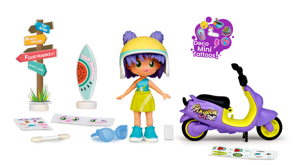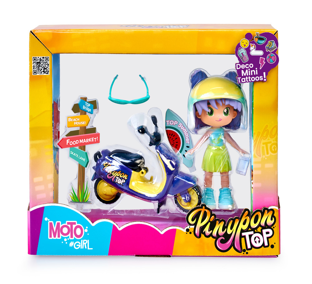 Set de una chica Pinypon TOP con su moto. Se incluyen unas gafas y un casco. Figura articulada de brazos y piernas, con doble cara, mini tatuajes para decorar y