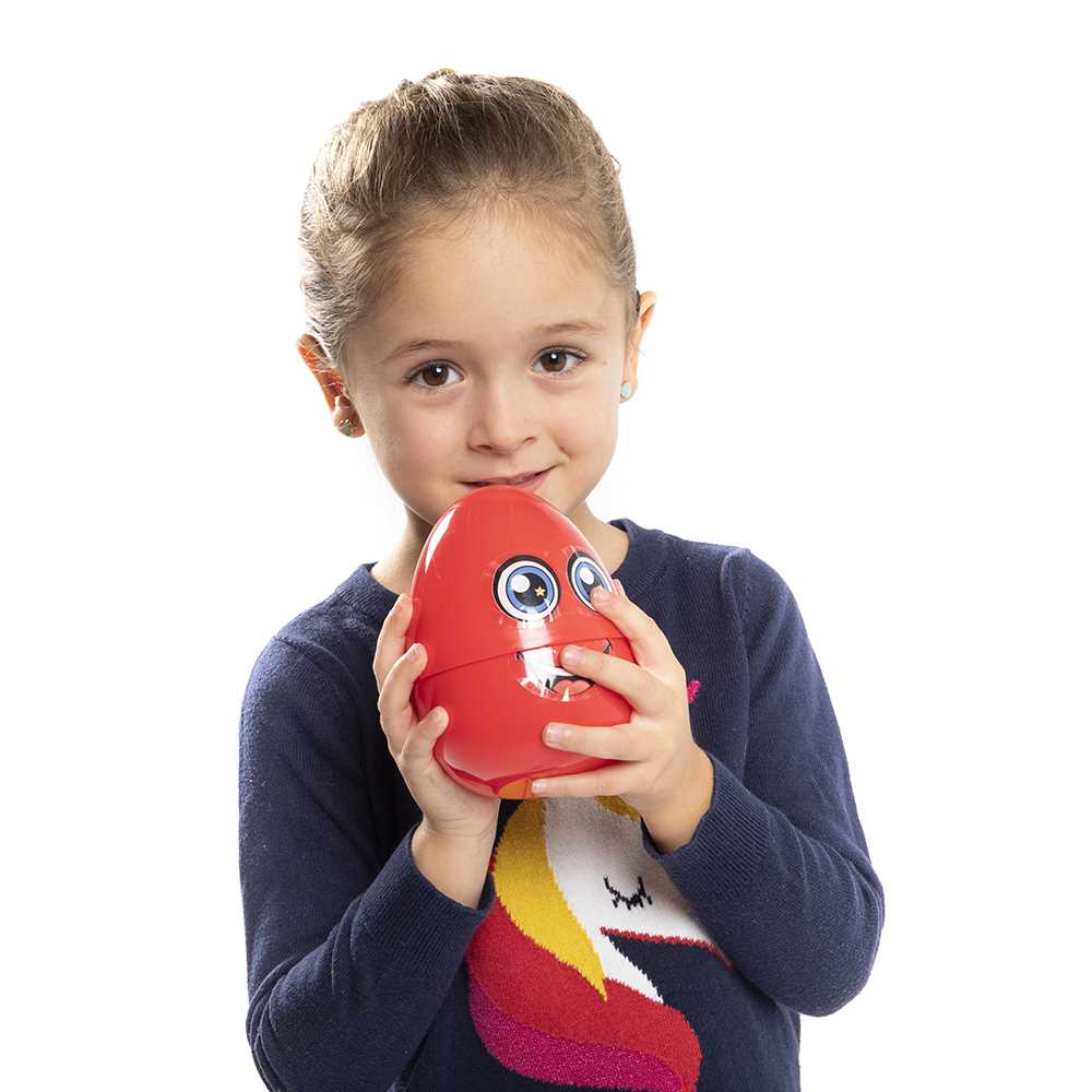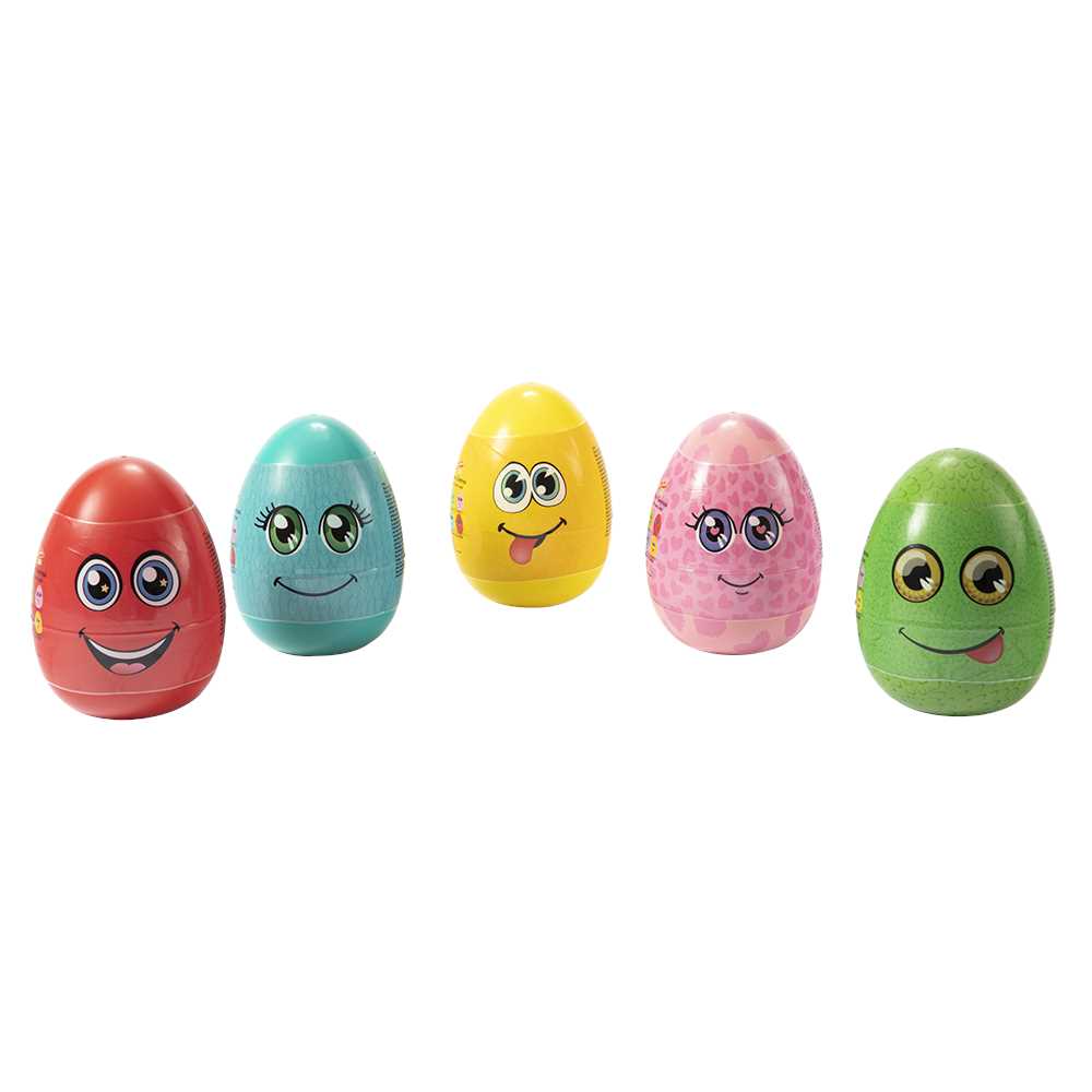 Cinco divertidos huevos de 12,5 cm con diferentes expresiones y colores, en su interior tienen una figura sorpresa, una hoja de pegatinas para personalizar tu huevo y una hoja de coleccionables.Se venden por sepradado.